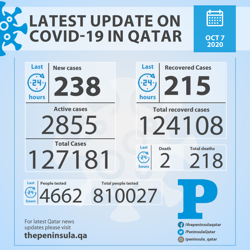 Doha: Ministry of Public Health (MoPH) today recorded 238 new cases of coronavirus (COVID-19) and 215 people recovered from the virus in the last 24 hours, bringing the total number of people recovered in Qatar to 124,108.