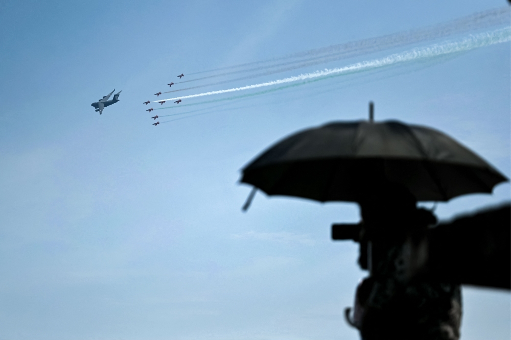 Surya Kiran Aerobatics Team of the Indian Air Force (IAF) perform an airshow during celebrations ahead of the Indian Air Force day at Marina beach in Chennai on October 6, 2024. All pictures by R.Satish Babu / AFP