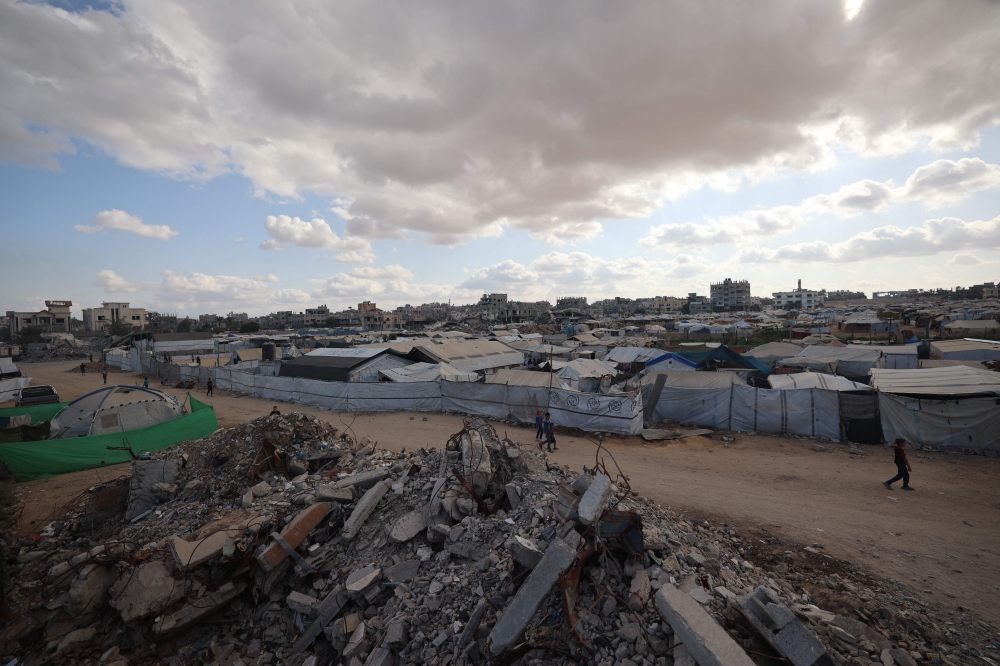 A general view shows people walking on a road between destroyed buildings and tents set up for displaced Palestinians on Oct 6, 2025. (Photo by Eyad Baba / AFP)