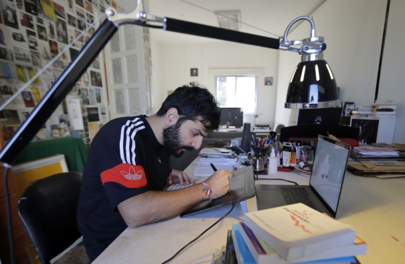 Lebanese cartoonist Mohamad Alameddine works at his studio in the capital Beirut on December 6, 2019. AFP / Joseph Eid