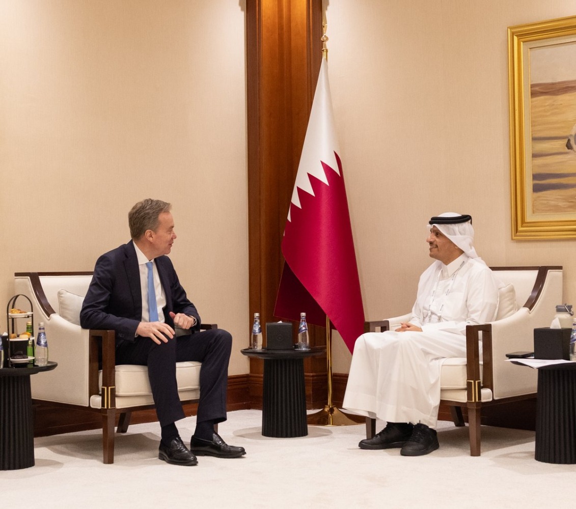 Doha, Qatar: Prime Minister and Minister of Foreign Affairs HE Sheikh Mohammed bin Abdulrahman bin Jassim Al-Thani met separately on Sunday with Secretary-General of the Digital Cooperation Organization (DCO) HE Deemah Al Yahya; President of the Assembly and Chair of the Council of the Global Green Growth Institute (GGGI) HE Ban Ki-moon; President and CEO of the World Economic Forum HE Borge Brende, on the sidelines of the 23rd edition of the Doha Forum 2025.