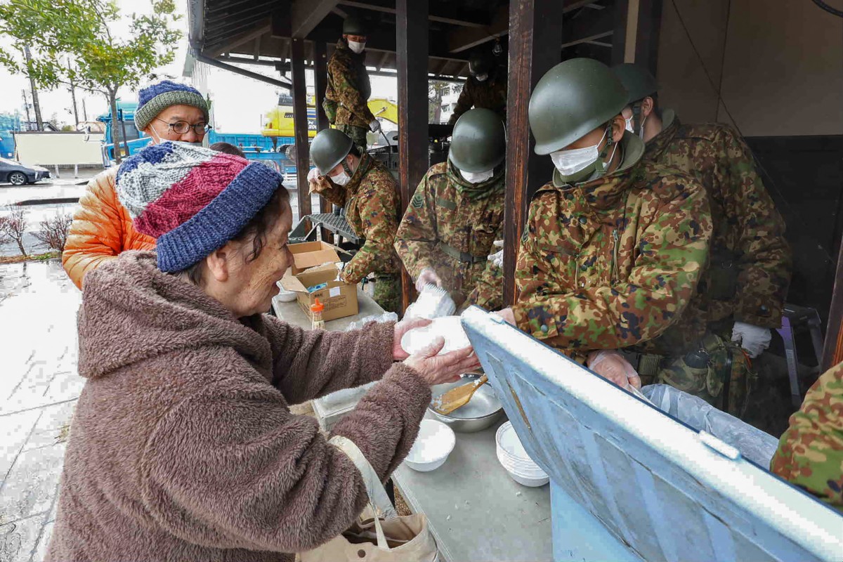 A woman receives food from Japanese Self-Defense Force personnel in the city of Suzu, Ishikawa prefecture on January 7, 2024, after a major 7.5 magnitude earthquake struck the Noto region in Ishikawa prefecture on New Year's Day. Photo by JIJI PRESS / AFP