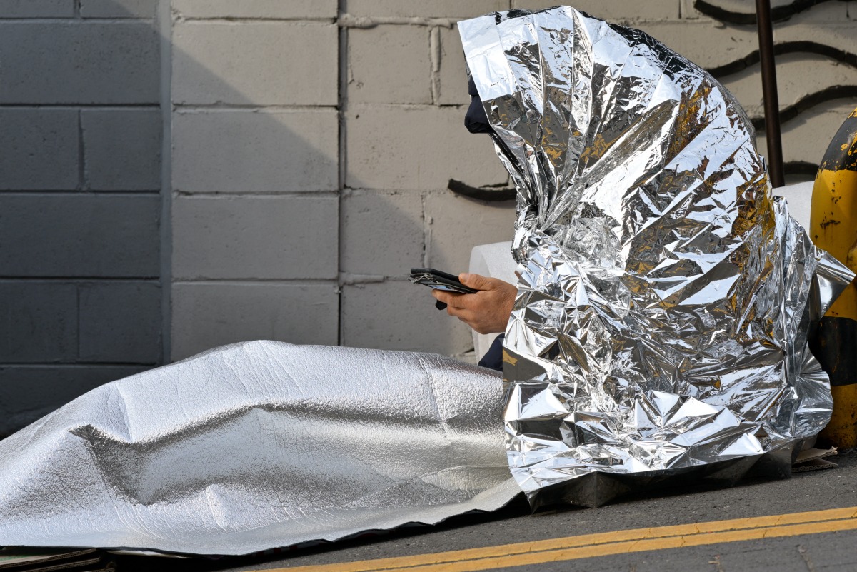 Supporter of impeached South Korea president Yoon Suk Yeol warms himself with thermal blanket during a rally near Yoon’s residence in Seoul on January 8, 2025. Photo by ANTHONY WALLACE / AFP