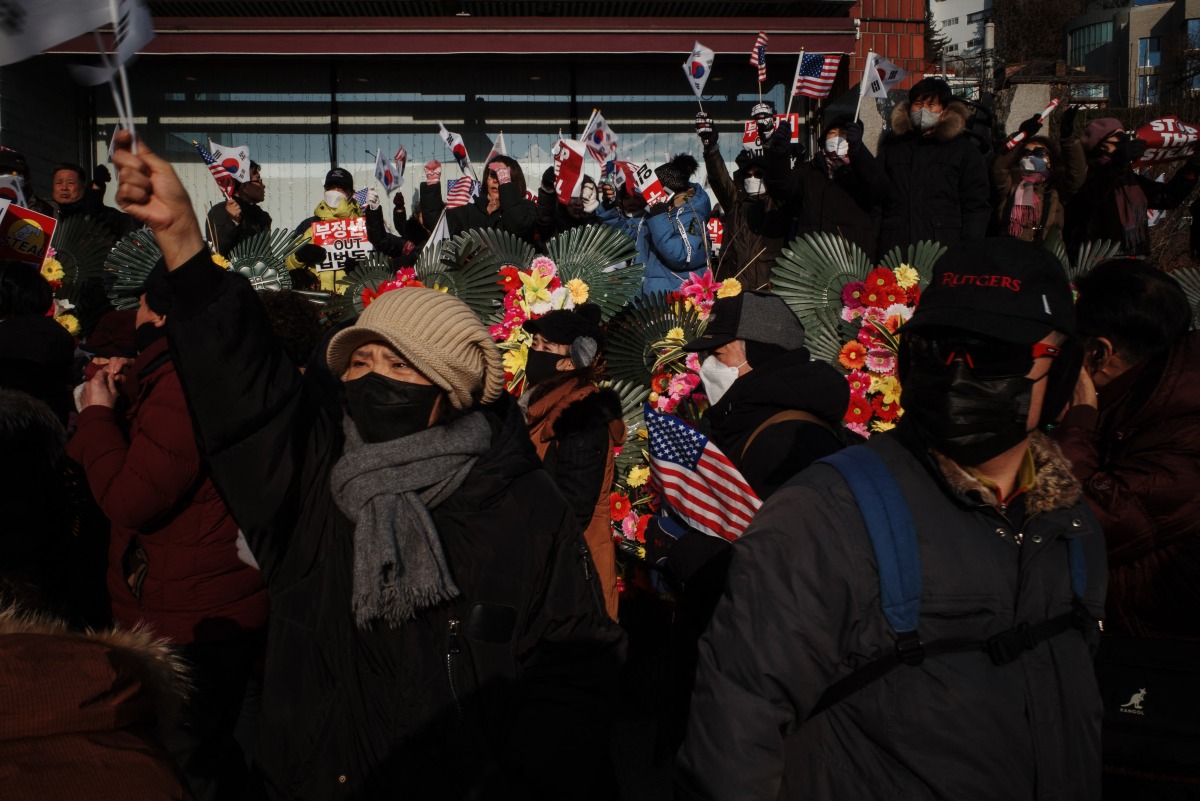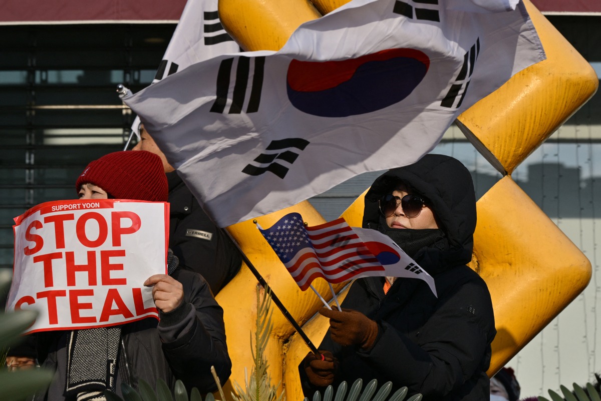 Supporters of impeached South Korea president Yoon Suk Yeol attend a rally near his residence in Seoul on January 8, 2025. Photo by Anthony WALLACE / AFP