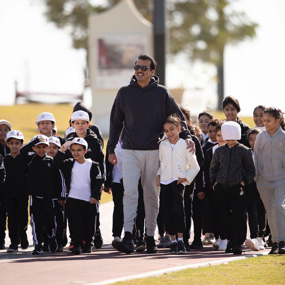HH the Amir practiced walking in Al Bayt Stadium Park's walkway, with the participation of a number of primary schools students, within the context of raising awareness among young people of the importance of sport and encouraging them to adopt healthy lifestyles and take care of physical fitness.