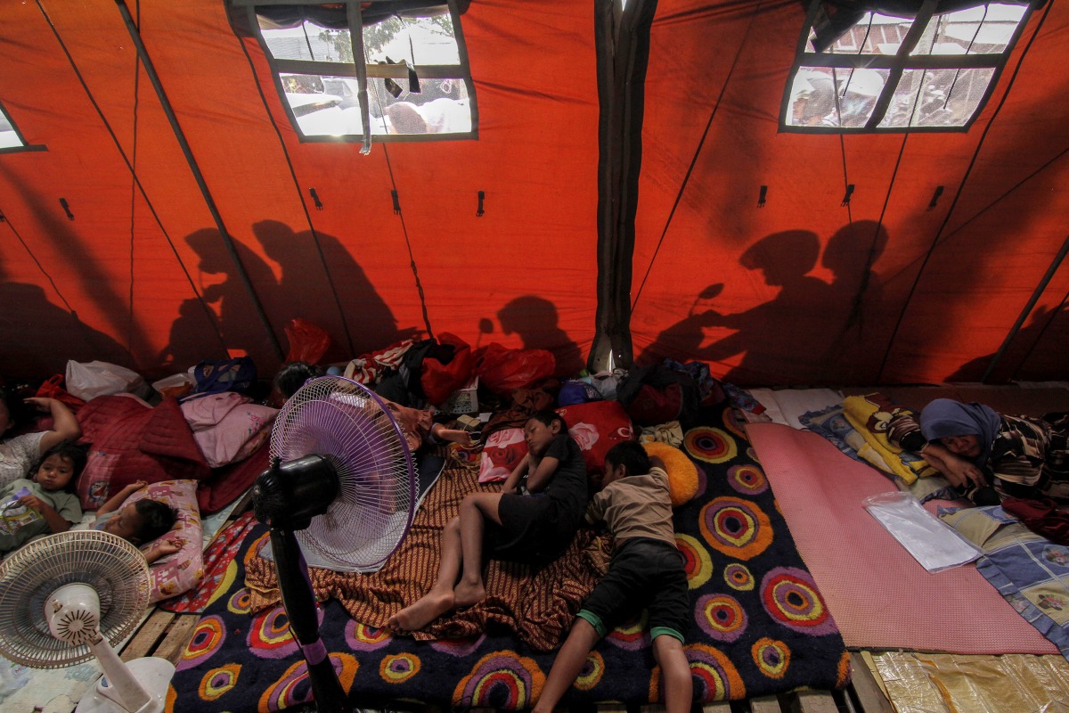 People rest at a temporary shelter after heavy rain and overflow of Siak River in Pekanbaru, Riau province, Indonesia, March 6, 2025. (Photo by Hadly Vavaldi/Xinhua)
