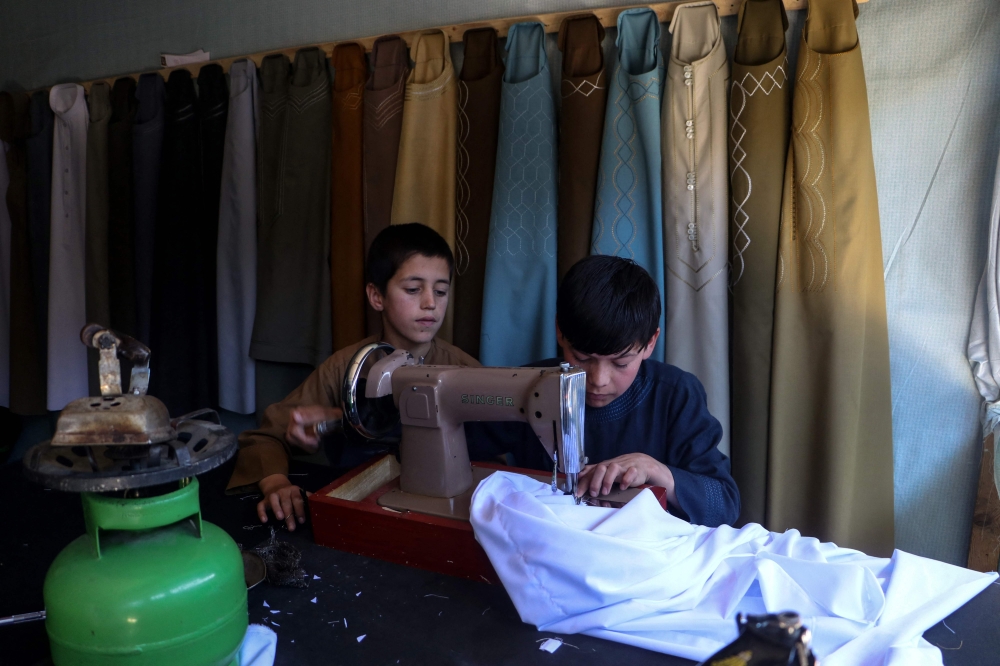 Afghan boys sew clothes at a shop, ahead of Eid al-Fitr, which marks the end of Muslim holy fasting month of Ramadan, in Fayzabad, Badakhshan province on April 8, 2024. (Photo by OMER ABRAR / AFP)