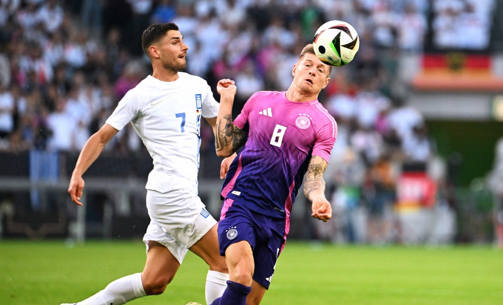 Germany's midfielder #08 Toni Kroos and Greece's forward #07 Georgios Masouras vie for the ball during the International friendly football match between Germany and Greece in Moenchengladbach, western Germany, on June 7, 2024. (Photo by Uwe Kraft / AFP)