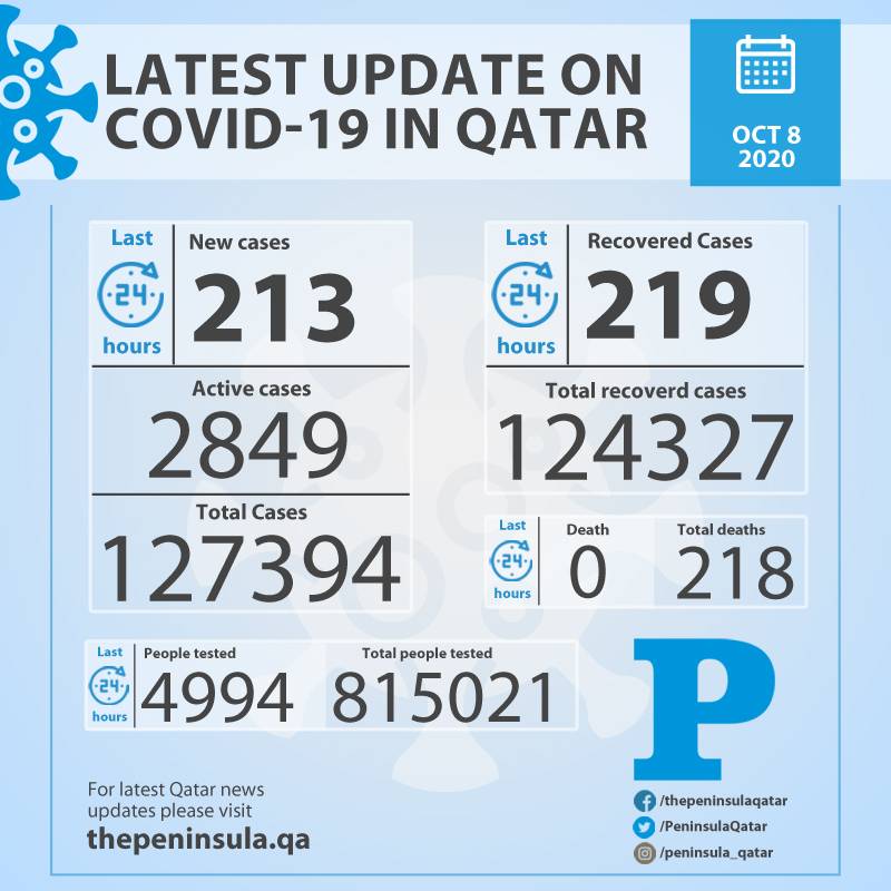 Doha: Ministry of Public Health (MoPH) today recorded 213 new cases of coronavirus (COVID-19) and 219 people recovered from the virus in the last 24 hours, bringing the total number of people recovered in Qatar to 124,327.