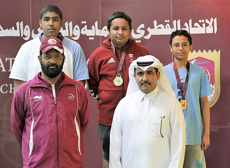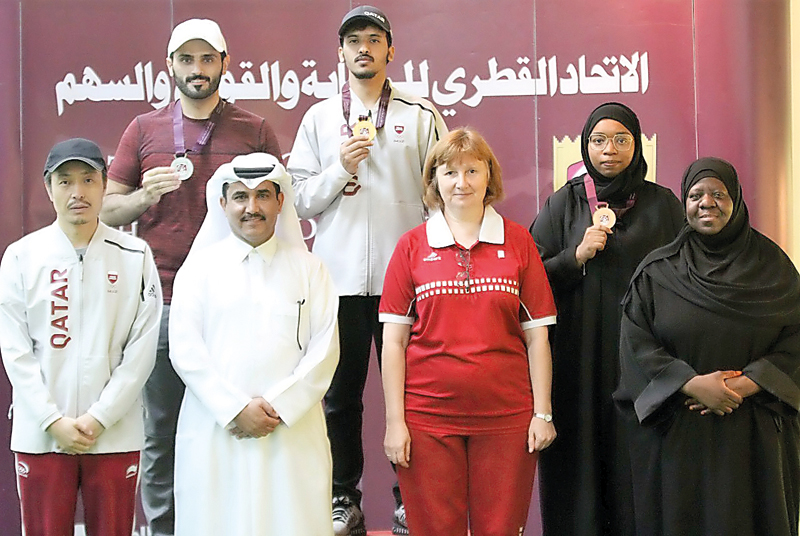The podium winners at the National Shooting and Archery Team Cup in 10m Air Pistol pose for a picture with officials of Qatar Shooting and Archery Association at Losail Shooting Range yesterday.