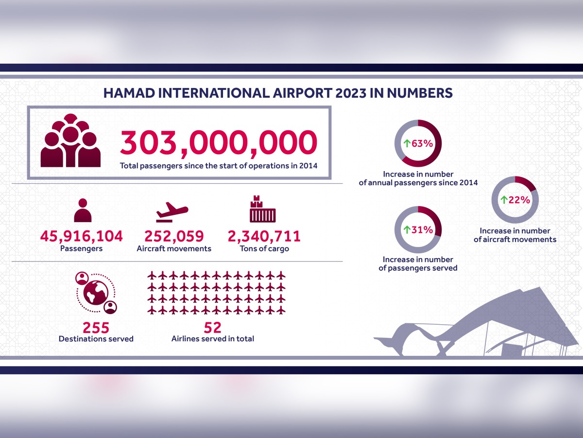 Throughout the year 2023, the award-winning airport has surpassed all expectations by serving an unprecedented 45,916,104 passengers, reflecting a remarkable 31% increase compared to 2022. Passenger volumes continued to climb in 2023, surpassing even the momentum established during the historic FIFA World Cup Qatar 2022.
