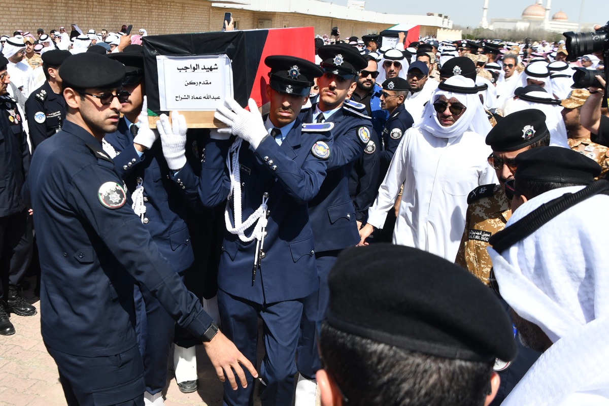 Kuwait: Kuwait held funeral ceremonies on Monday for two members of the General Directorate of Land Border Security who were martyred while performing their national duty.