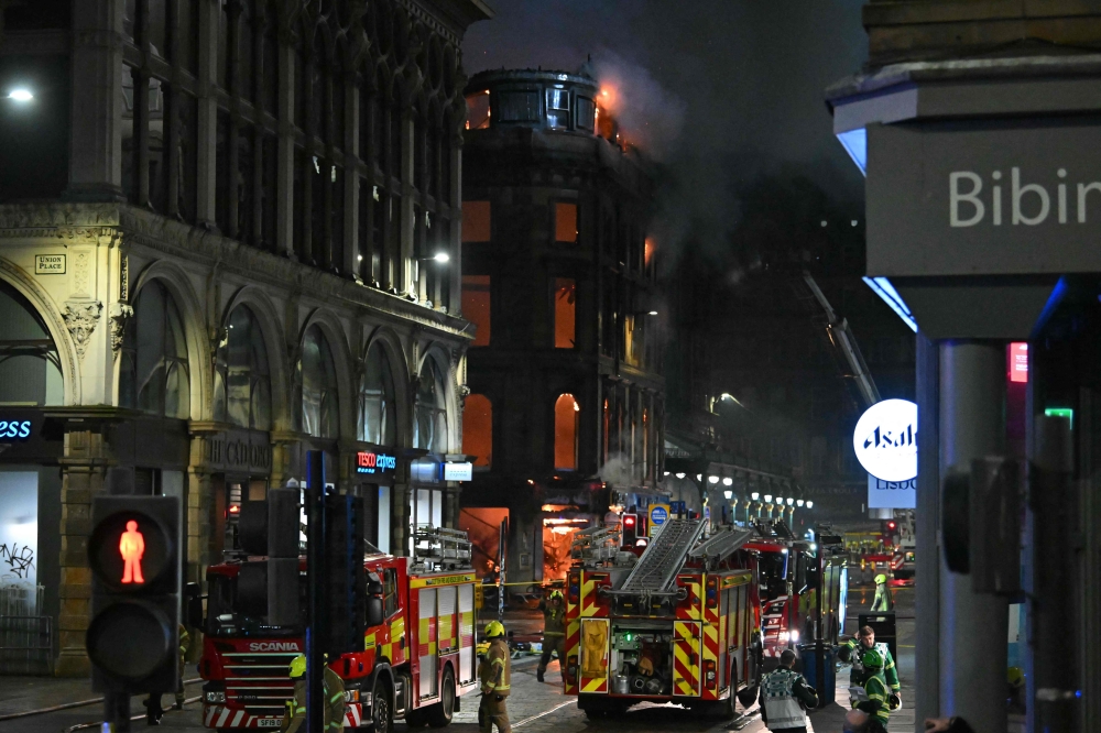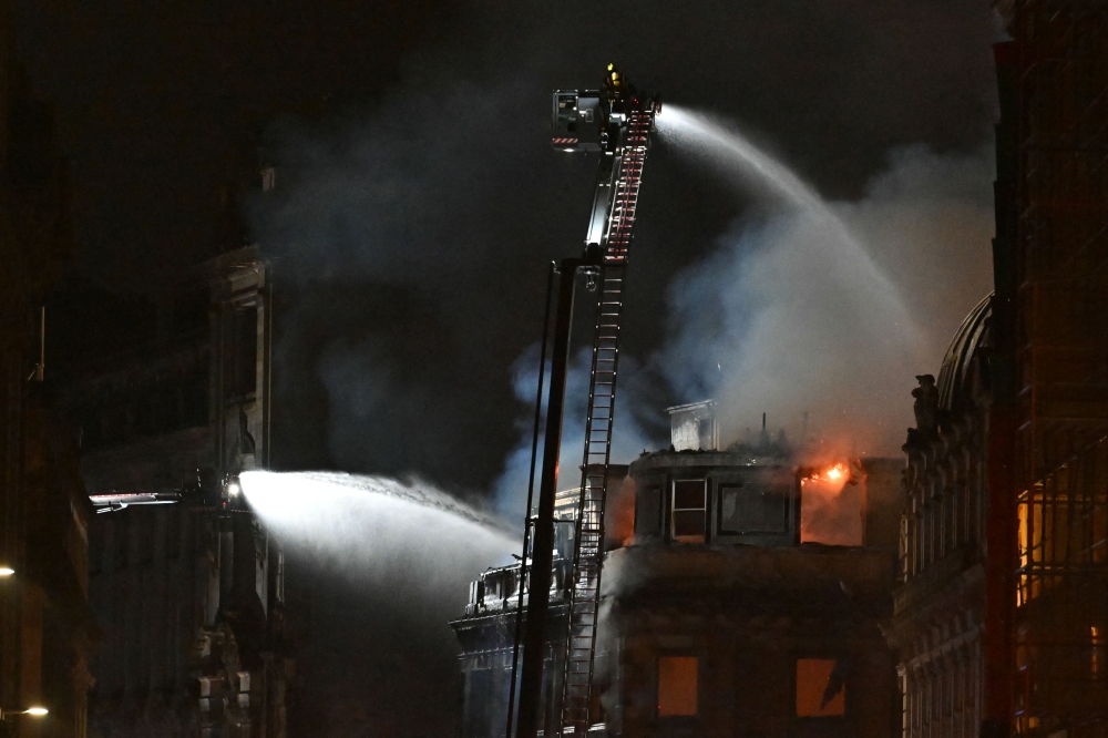 Floors collapse inside the building as fire fighters work at the site of a large fire in Glasgow City centre on March 8, 2026. (Photo by Andy Buchanan / AFP)