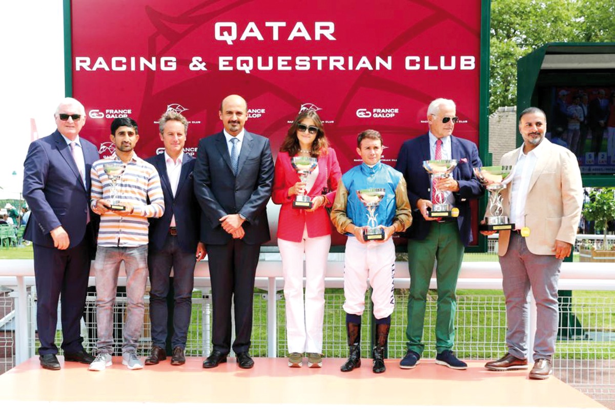 Qatar Racing and Equestrian Club (QREC) Board Member Khalifa bin Mohammed Al Attiyah crowned the winners of the Doha Cup, at Deauville Racecourse in France, yesterday. Pictures: Scoopdyga