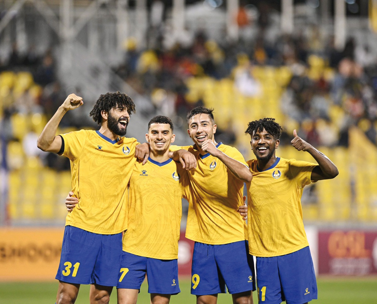 Suhaib Gannan (right) celebrates with teammates after scoring Al Shamal's third goal.