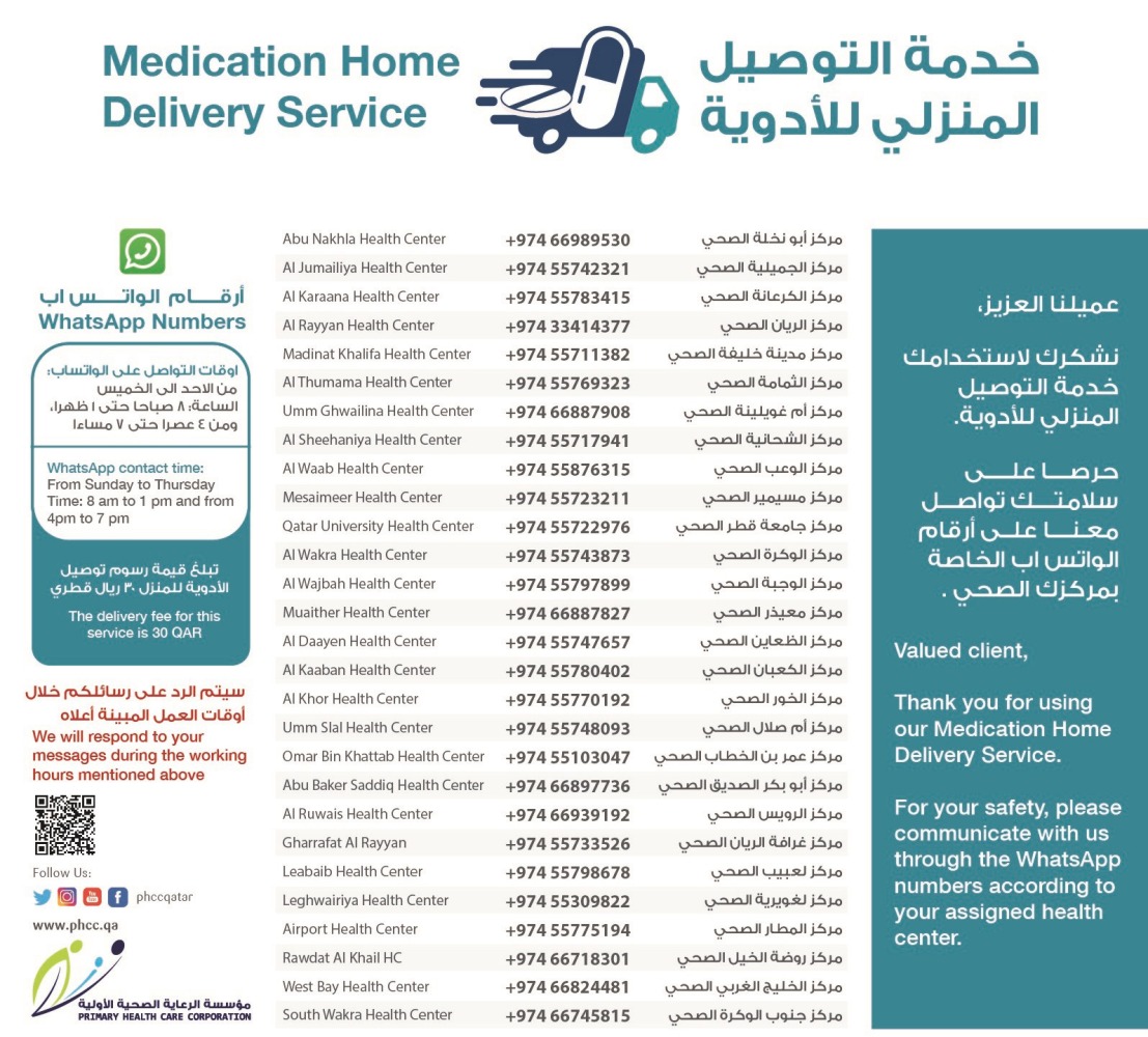 The patient can send a WhatsApp text message with the word “hello” to the number of his health center after which the pharmacist will contact the patient as soon as possible, and then the medicines will be delivered home by Qatar Post within two working days for a fee of QR 30 to be paid to Qatar Post employees when delivering medicines.