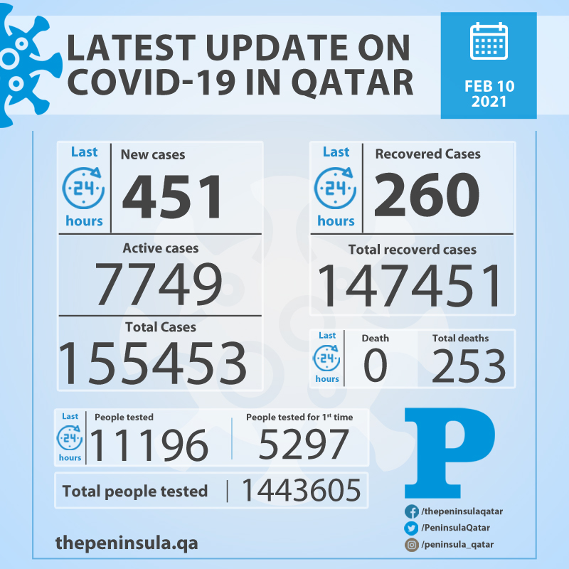 Doha: Ministry of Public Health (MoPH) today reported 451 new cases of coronavirus (Covid-19) and 260 people recovered from the virus in the last 24 hours, bringing the total number of people recovered in Qatar to 147,451.