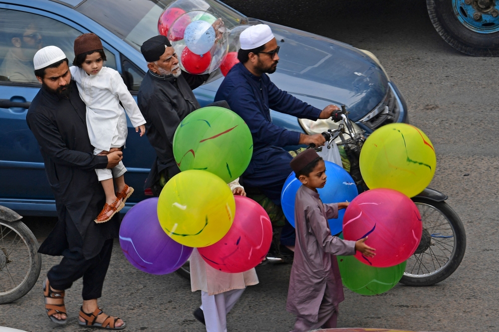 Muslim devotees hold balloons after offering Eid al-Fitr prayers in Karachi on April 10, 2024. (Photo by Asif Hassan / AFP)