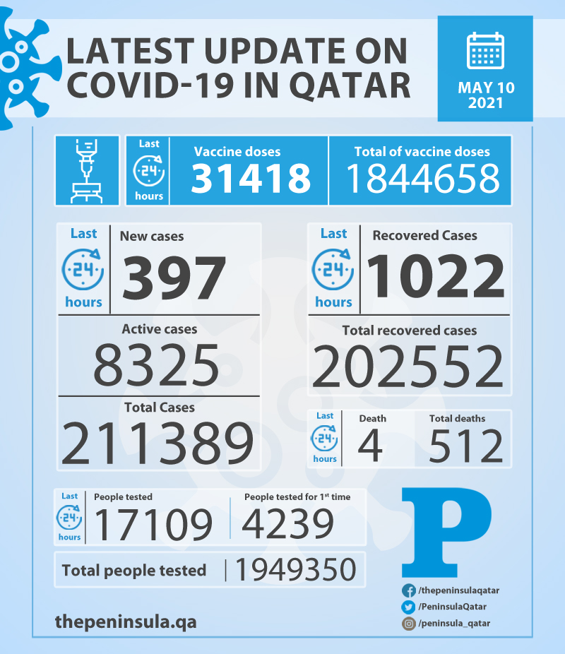The total number of positive Covid-19 cases recorded in Qatar is 211,389 and there are 8,325 active cases under treatment.