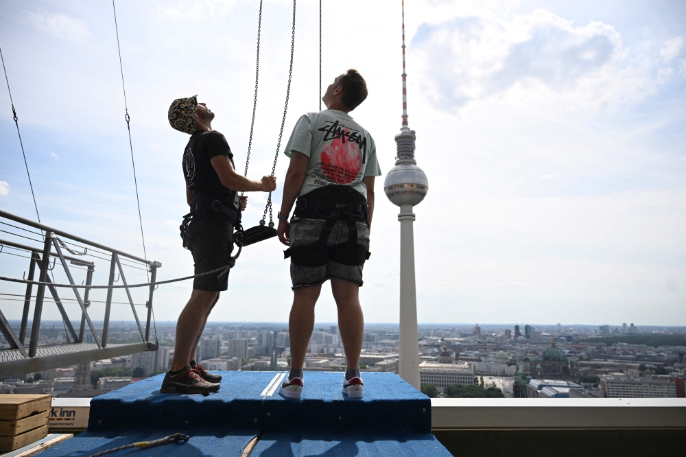 Pascal Vent (R) gets ready to sways 120m above the rooftops of Berlin, from Europe痴 highest swing at Alexanderplatz, on July 31, 2024. Photo by RALF HIRSCHBERGER / AFP