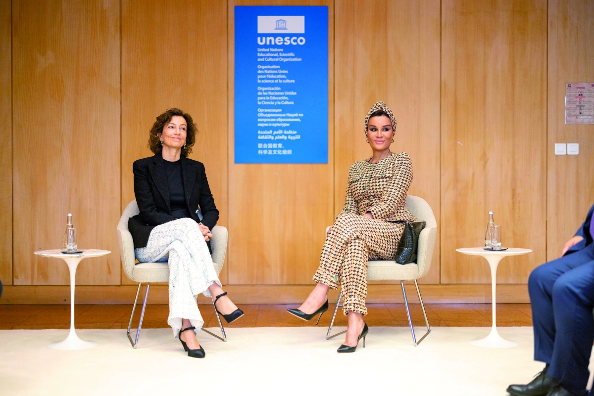 H H Sheikha Moza bint Nasser meeting the Director-General of the United Nations Educational, Scientific and Cultural Organization (Unesco) Audrey Azoulay. They discussed the existing partnerships.