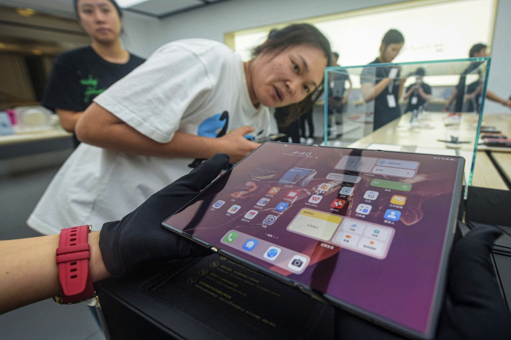 Chinese tech giant Huawei's new trifold phone Huawei Mate XT is displayed during its launch day at a Huawei store in eastern China's Zhejiang province on September 10, 2024. (Photo by AFP)