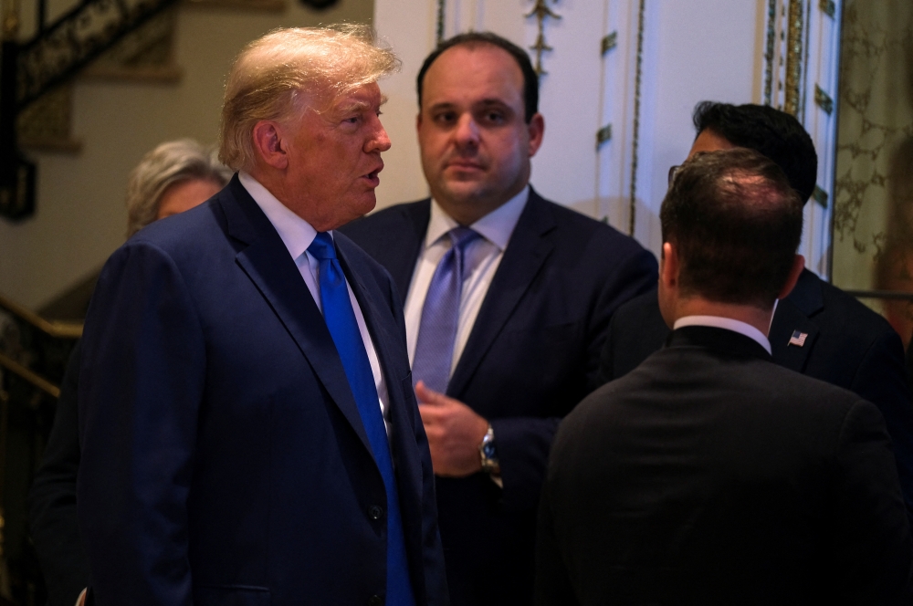 Former US President Donald Trump speaks with aides including Boris Epshteyn, at his Mar-a-Lago resort on the night of the 2022 US midterm elections in Palm Beach, Florida, US, November 8, 2022. (REUTERS/Ricardo Arduengo)