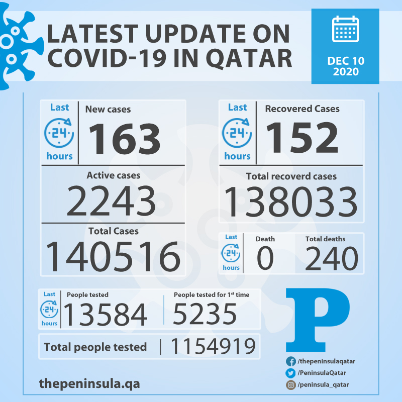 Doha: Ministry of Public Health (MoPH) today recorded 163 new cases of coronavirus (COVID-19) and 152 people recovered from the virus in the last 24 hours, bringing the total number of people recovered in Qatar to 138,033.