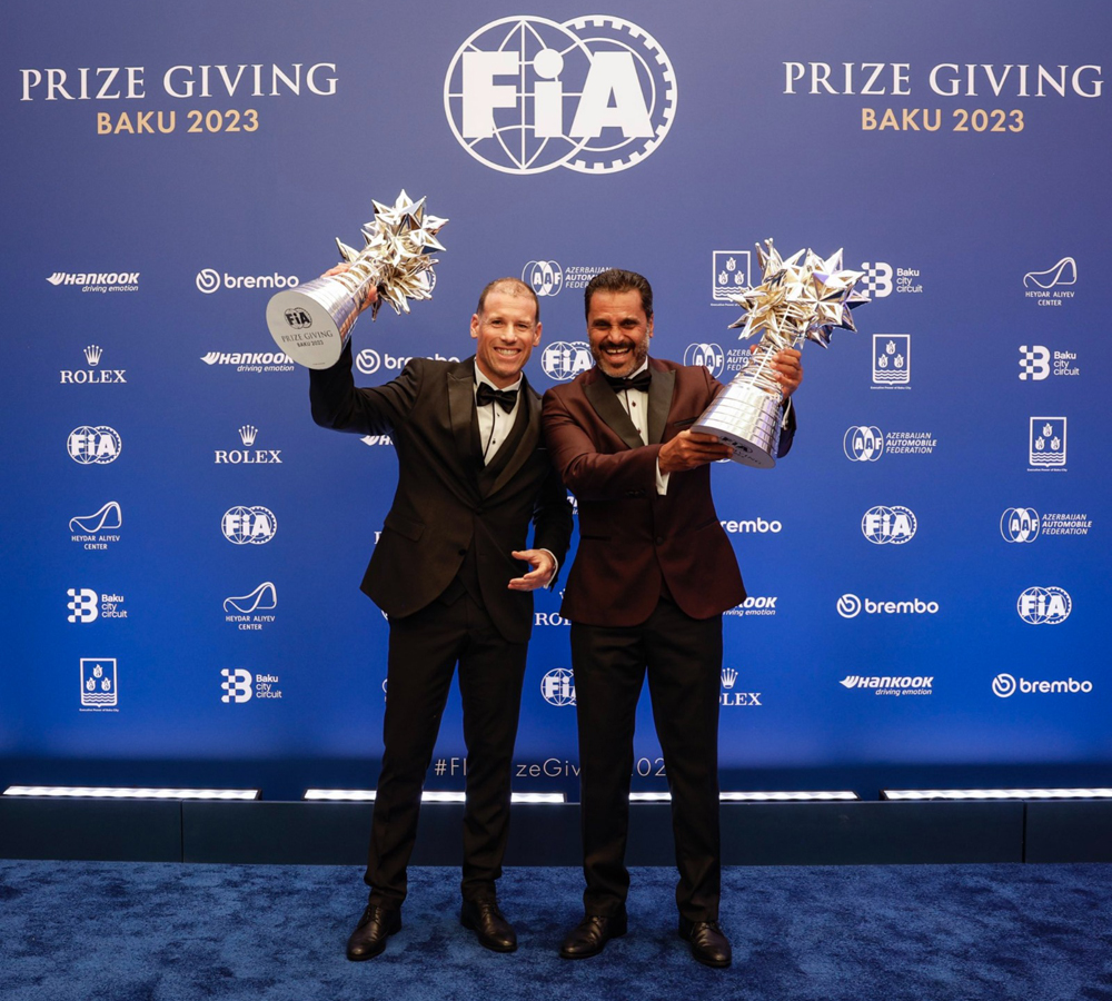 Qatari racing legend Nasser Al Attiyah (right) and his French co-driver Mathieu Baumel pose with their World Rally-Raid trophies during the FIA Awards in Baku, Azerbaijan. Al Attiyah won the FIA World Cup for Cross-Country Bajas after a gap of 15 years.