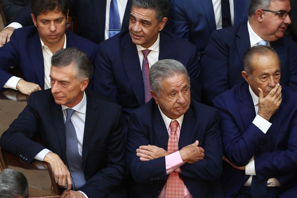 (L-R, first row) Argentina's ex-presidents (2015-2019) Mauricio Macri, (2002-2003) Eduardo Duhalde and (2001) Adolfo Rodriguez Saa attend the inauguration of Argentina's new president Javier Milei (out of frame) at the Congress in Buenos Aires on December 10, 2023. (Photo by ALEJANDRO PAGNI / AFP)