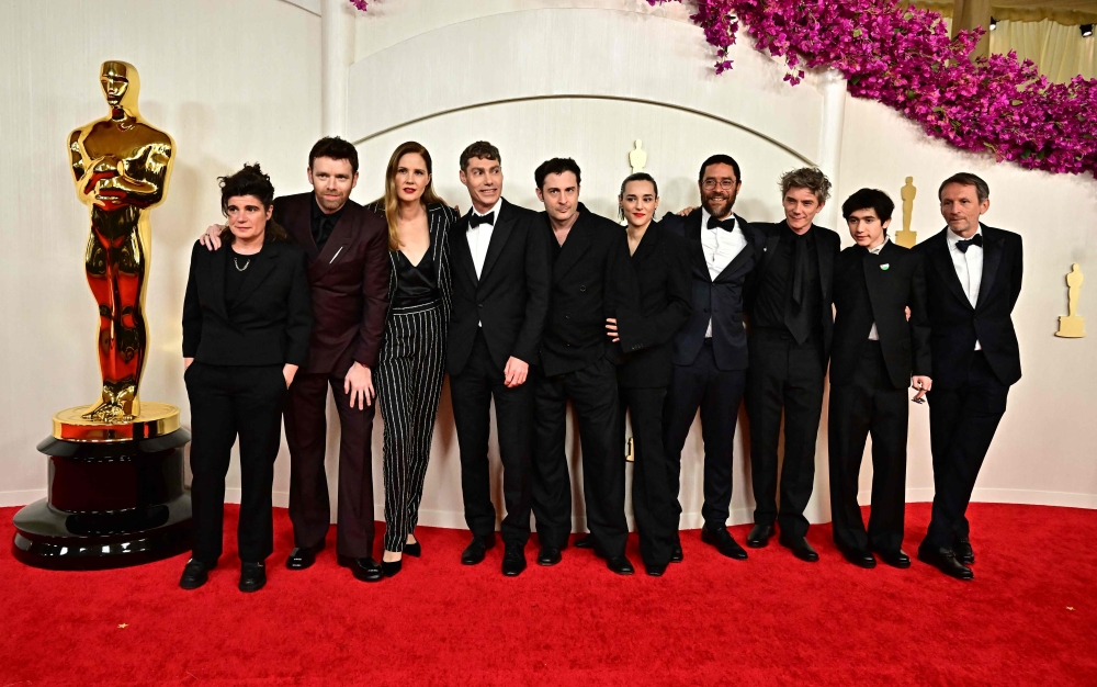 French film director and screenwriter Justine Triet (3rd left) and cast and producers of French film 'Anatomy of a Fall' attend the 96th Annual Academy Awards at the Dolby Theatre in Hollywood, California on March 10, 2024. (Photo by Frederic J. Brown / AFP)