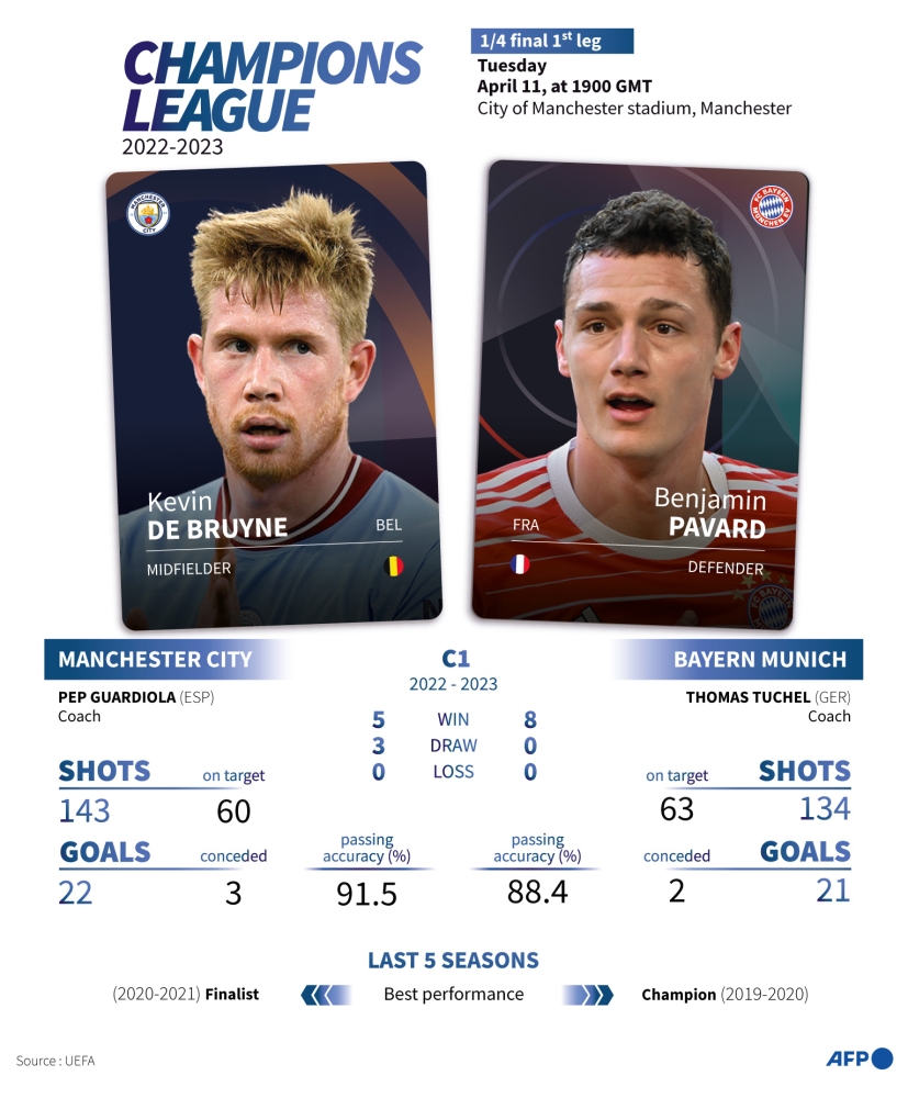Pep Guardiola and Thomas Tuchel go head-to-head again in the Champions League when Manchester City hosts Bayern Munich in the first leg of the quarterfinals.