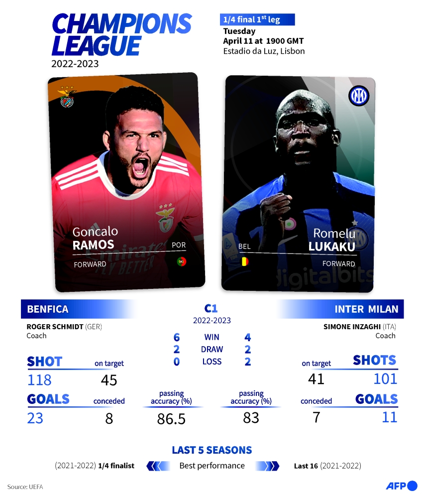 Inter is aiming to reach the last four for the first time since it won the title in 2010. Benfica hopes to make it past the quarterfinals for the first time since 1990. Its loss to rival Porto in the Portuguese league on Friday was only the team's second defeat of the season in all competitions.