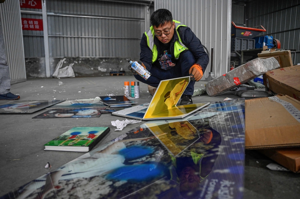 This photo taken on March 27, 2024 shows worker Yang Weiguang (R) placing a large wedding photo into a shredding machine as Liu Wei takes videos on the side at a warehouse in Langfang, in northern China's Hebei province. (Photo by Jade Gao / AFP)