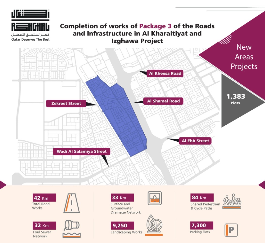 Doha, Qatar: The Public Works Authority (Ashghal) announced the completion of works of the third package of the Roads and Infrastructure Development Project in Al Kharaitiyat and Izghawa, which the Authority is implementing in four development packages with the aim of enhancing road network and infrastructure services.
