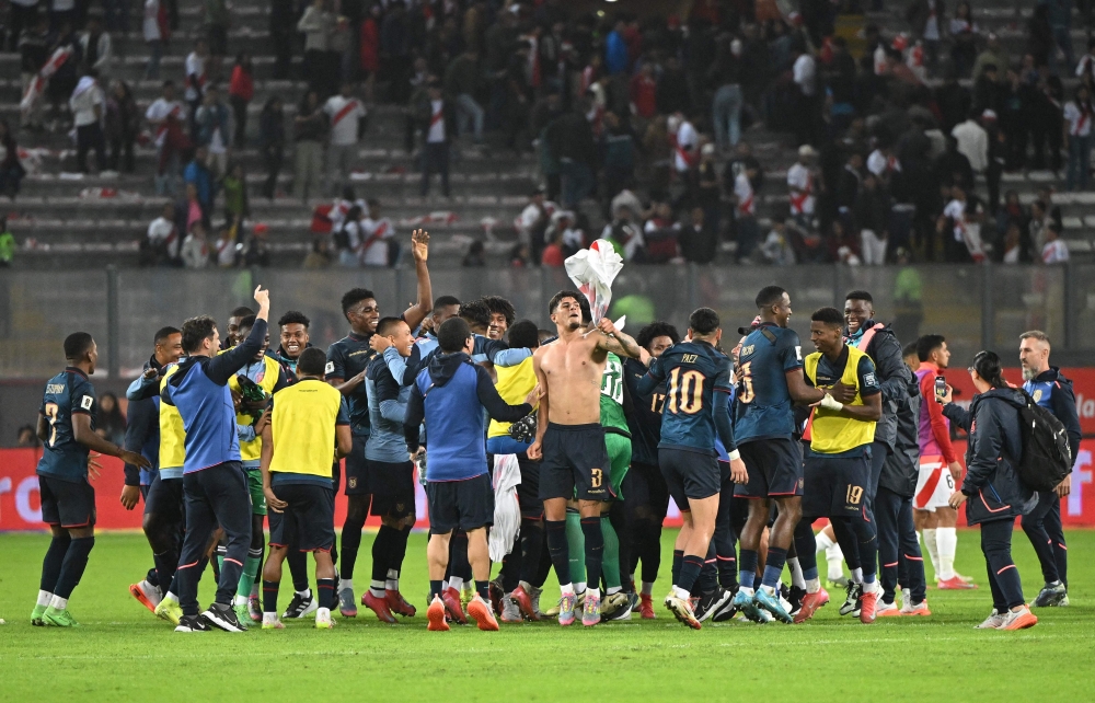 Ecuador players celebrate after the 2026 FIFA World Cup South American qualifiers football match between Peru and Ecuador at the National stadium in Lima, on June 10, 2025. (Photo by Ernesto Benavides / AFP)