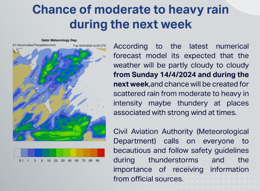 "According to the latest numerical forecast model, it's expected that the weather will be partly cloudy to cloudy from Sunday 14/4/2024 and during the next week, and there is chance for scattered rain from moderate to heavy in intensity maybe thundery at places associated with strong wind at times."