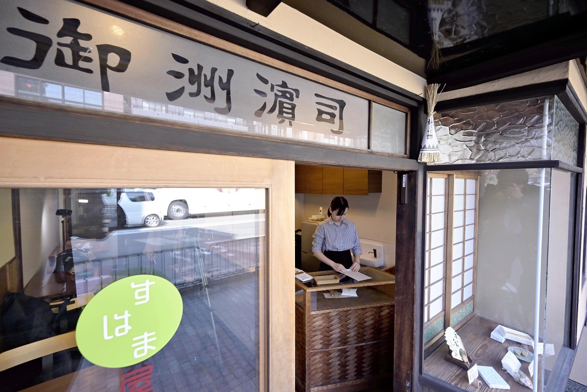 The words "On-Suhama Tsukasa” are written above the entrance to Yoshino’s shop.