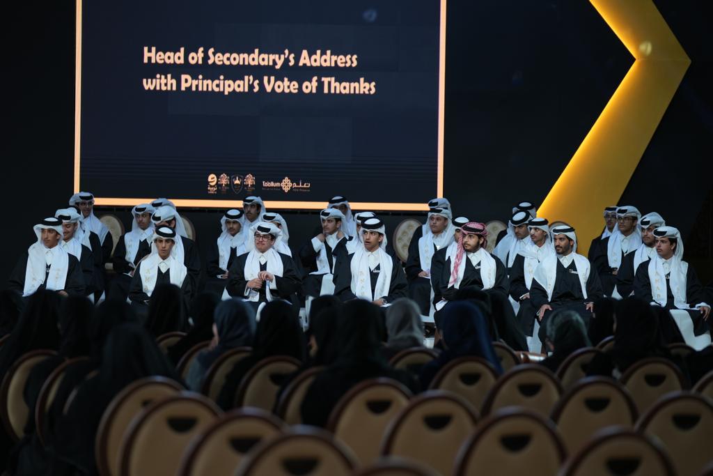 The ceremonies featured speeches by Heads of Secondary School: Mr. James McAleese (AJA), Ms. Loretta Conway, (AMAG) and Mr. Steve Roger (AMAB), who paid tribute to their students’ achievements. These were followed by the customary address by the Head Boys and Girls: Ahmed Adel Al-Hammadi for AMAB, with Hamad Ghanim Alsaad Al-Kuwari and Abdulrahman Eisa Al-Bukhari; at AMAG, the Head Girl: Tarteel El-Amin Emam, with Sheikha Jassim Al Sulaiti; at AJA, Head Girl: Nawarah Hussein with Deputy Heads, Fajer Al Hamadi and Hissa Al Abdulghani; and Head Boy: Mohamed Redhwani with Deputy Heads, Youssef Mahmoud and Abdulaziz Al-Thani (AJA). All spoke eloquently and respectfully on behalf of the graduates, offering gratitude to teachers, parents and families who had supported them.