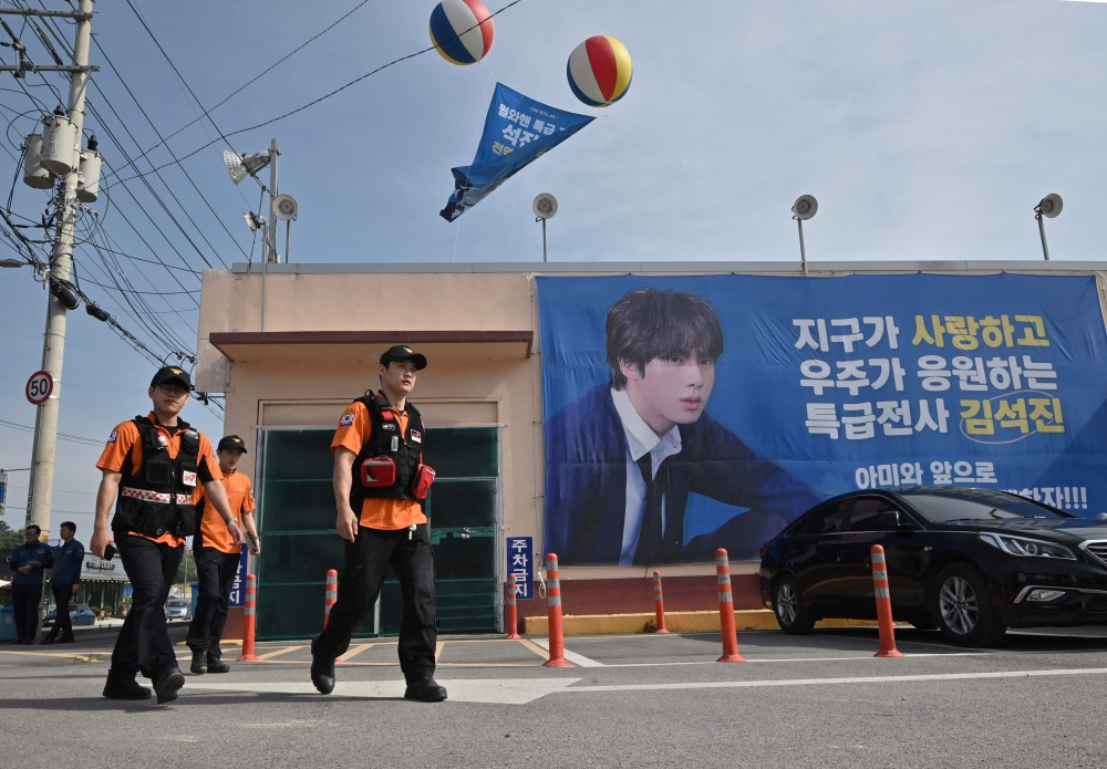 Firefighters walk past a banner showing a picture of K-pop boy band BTS member Jin in front of a military base in Yeoncheon on June 12, 2024. (Photo by Jung Yeon-je / AFP)
