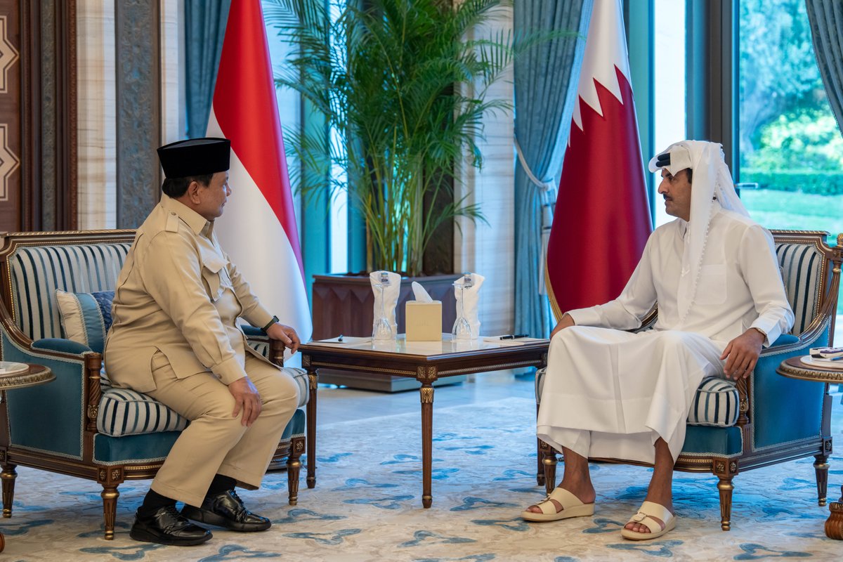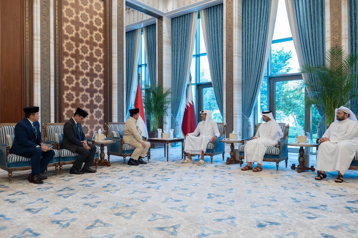 Doha, Qatar: The Amir HH Sheikh Tamim bin Hamad Al-Thani and the President of the Republic of Indonesia HE Prabowo Subianto held a meeting at his office in Lusail Palace on Friday. Discussions during the meeting dealt with bilateral relations between the two countries, and means to strengthen them in various fields.