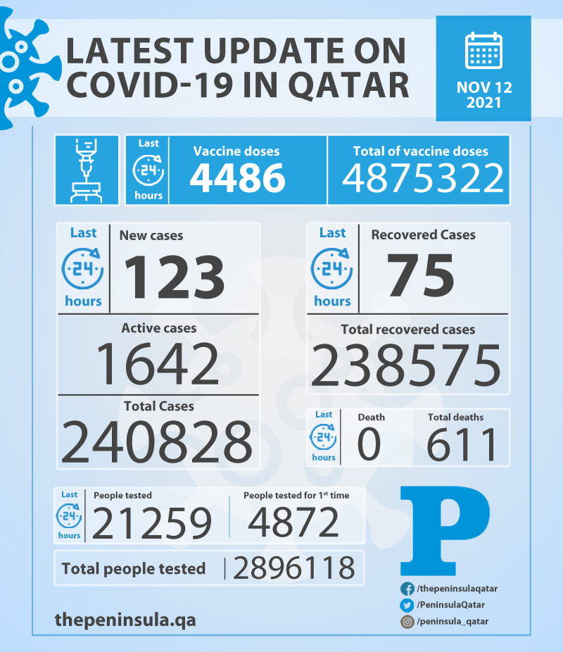 Doha: Ministry of Public Health (MoPH) today recorded 123 new cases of coronavirus (COVID-19) and 75 people recovered from the virus in the last 24 hours, bringing the total number of people recovered in Qatar to 238,575.