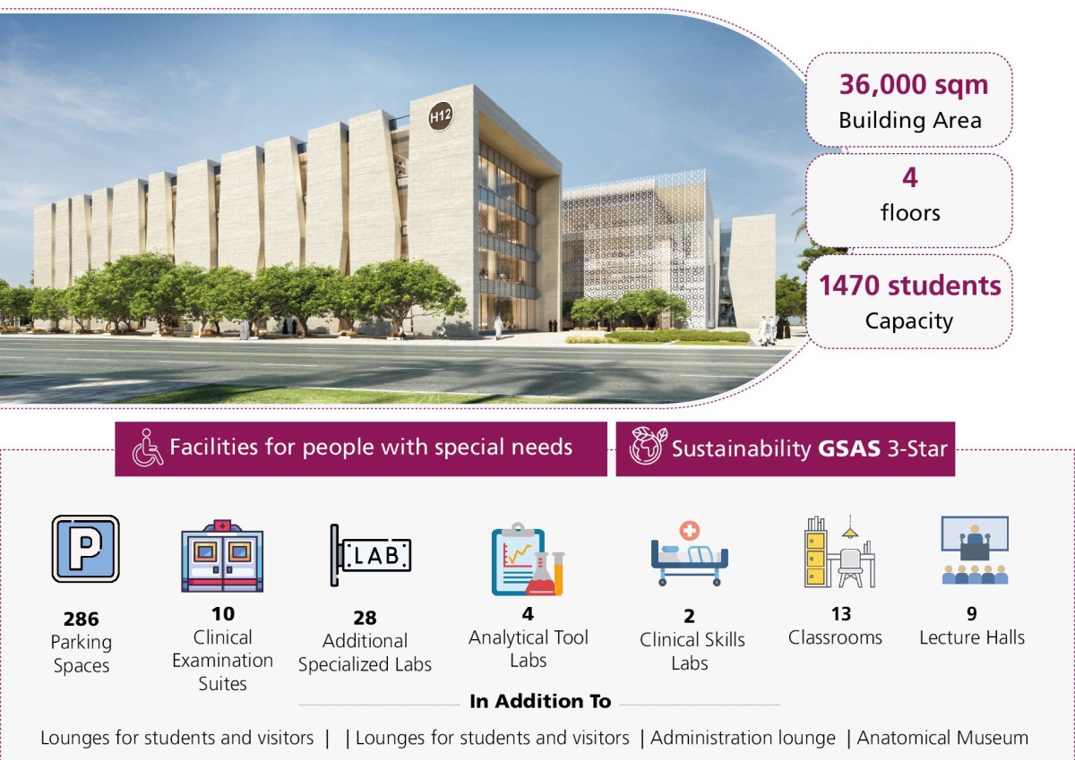 Eng. Aisha Ali Al-Sada, Project Manager, confirmed that the building includes 286 parking spaces to serve students and visitors. In addition to 9 large lecture halls, 13 small study halls, two clinical skills labs, four analytical tool labs, and 28 additional specialized labs and 10 clinical examination suites to provide an integrated theoretical and practical educational experience.