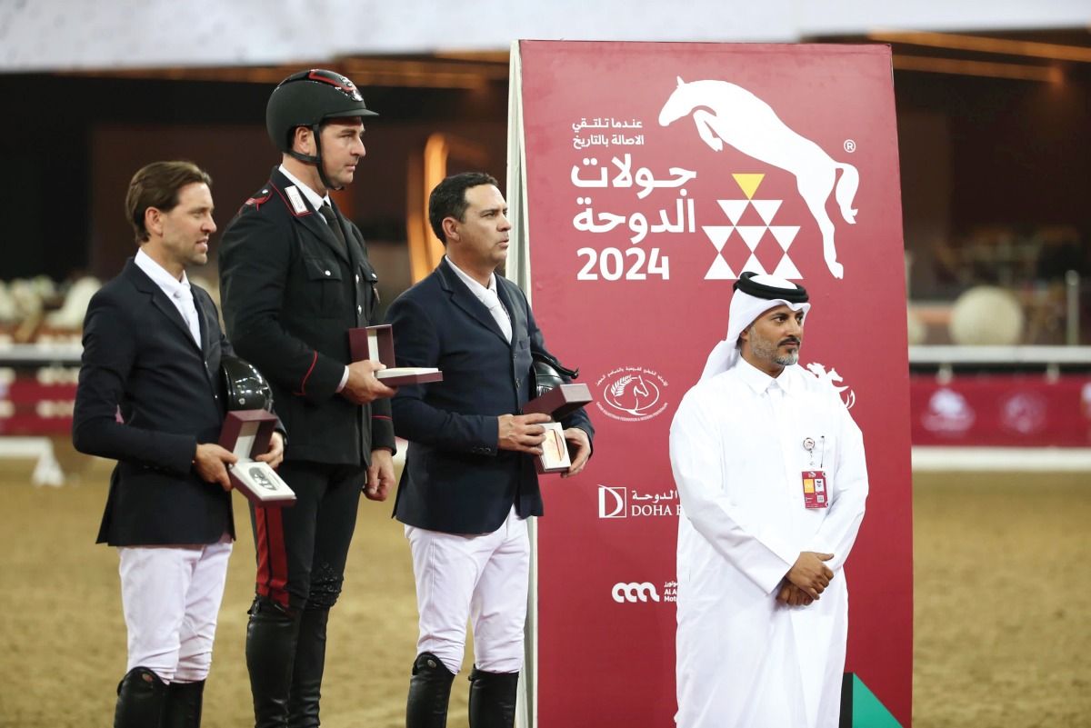 Member of the Supreme Organising Committee of the Doha Tour Ali bin Yousef Al Rumaihi with podium winners of 1.50m CSI4* event on second day of Doha Tour at Al Shaqab yesterday.