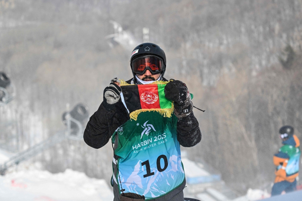 Afghanistan's Ahmad Romal Hayat holds his national flag before a snowboard halfpipe training session during the during the Harbin 2025 Asian Winter Games in Yabuli, Northeast China's Heilongjian province on February 12, 2025. (Photo by Hector Retamal / AFP)