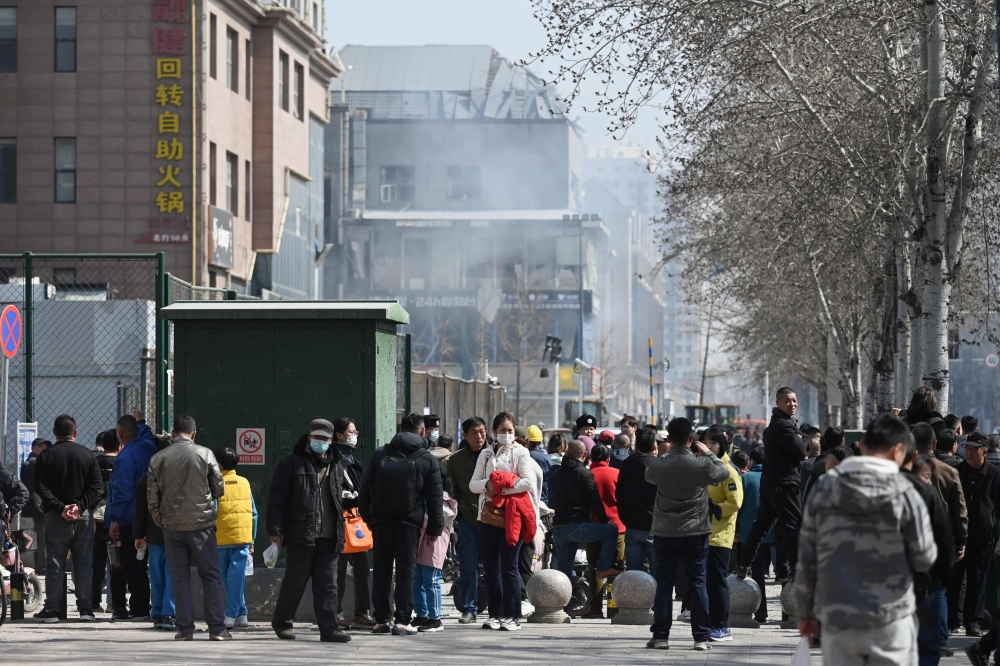 People gather as they watch rescue operations at the scene of a suspected gas explosion in Sanhe, in China's northern Hebei province on March 13, 2024. Photo by GREG BAKER / AFP