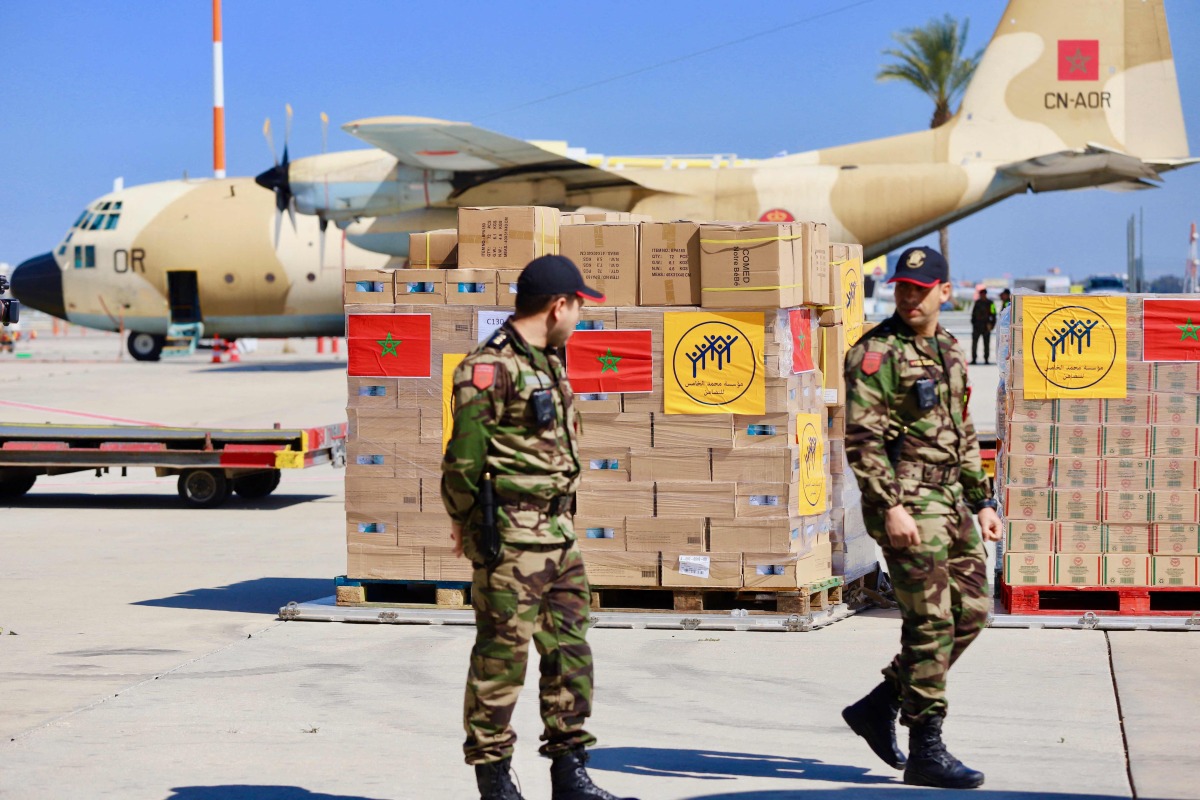 This handout picture taken on March 11, 2024 by the Maghreb Arabe Presse shows members of the Moroccan Armed Royal Forces (FAR) standing next to humanitarian aid shipped from Morocco to the people in gaza and being handled at the Israeli Ben Guiron Airport in Tel Aviv. (Photo by Maghreb Arabe Presse / AFP)