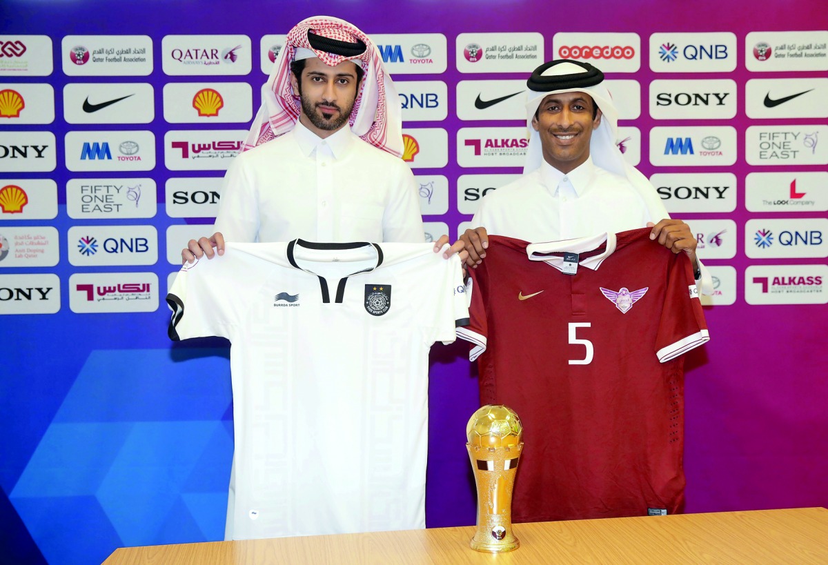 Representatives of the Al Sadd and El Jaish pose with their team jerseys after the technical committee of the Emir Cup semi-final.