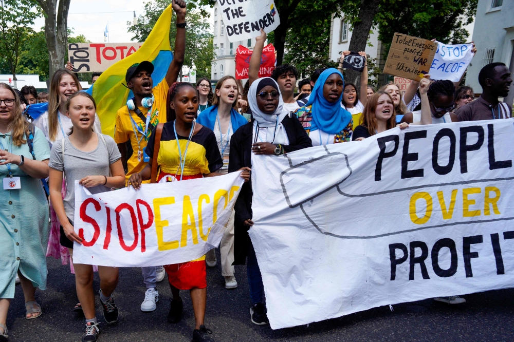 Swedish climate activist Greta Thunberg (2nd left) and Ugandan climate activist Patience Nabukalu (3rd left) march with other activists in Bonn, western Germany on June 12, 2023, during a demonstration of Fridays for Future to demand the stop of further funding of new fossil projects, neither by states nor by banks. (Photo by Bernd Lauter / AFP)