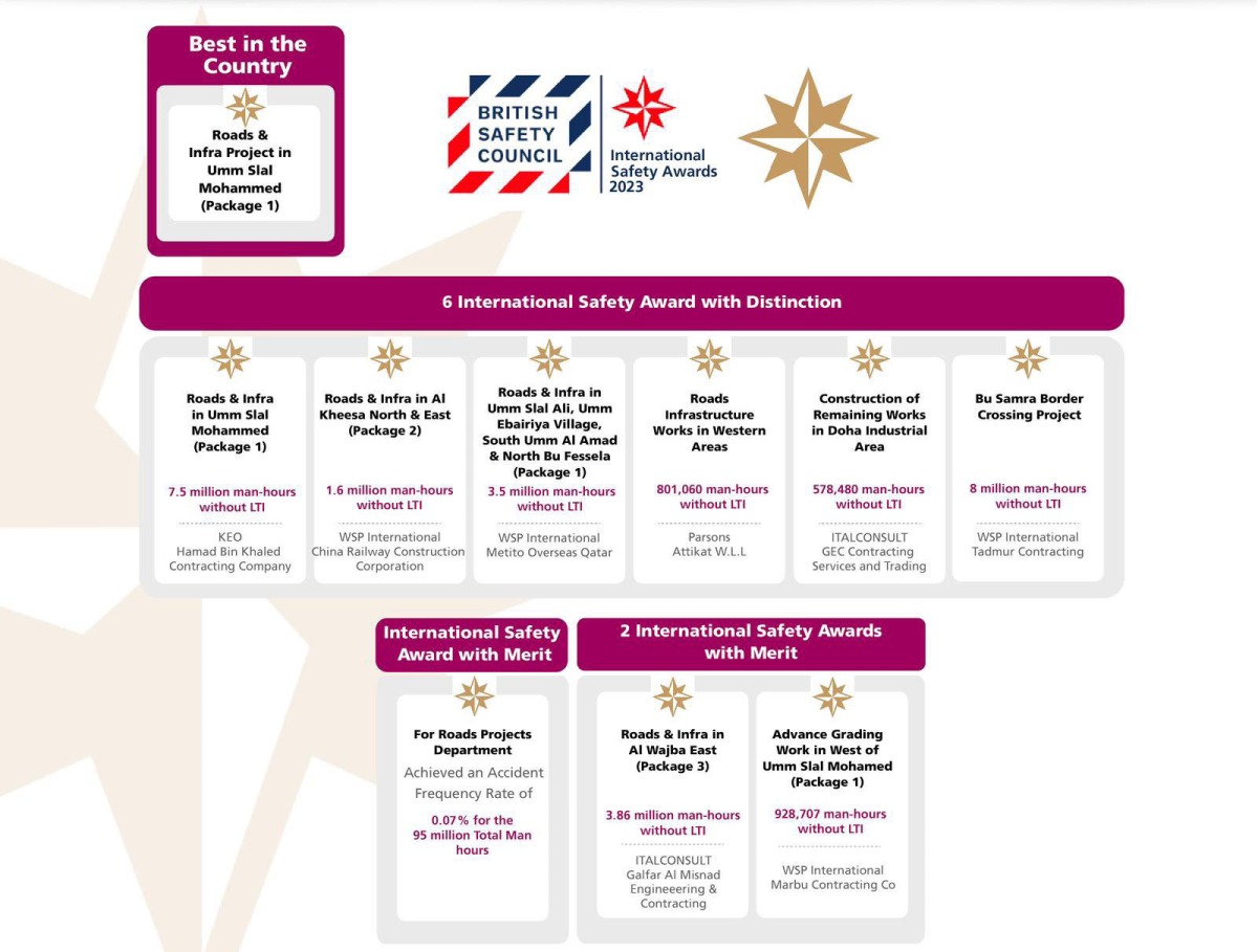 The winning projects include the Roads and Infrastructure project in Umm Slal Ali, Umm Ebairiya Village, South Umm El Amad and North Bu Fessela (Package 1), Al Wajba East Project (Package 3), Al Kheesa North and East (Package 2), Umm Slal Mohammed (Package 1), Road Grading Project in West of Umm Slal Mohammed (Package 1), Abu Samra Border Crossing Project, the Construction of Remaining Works in Doha Industrial Area, and the Road Improvement Works in Western Areas. The efforts of the Roads Projects Department’s Health, Safety and Workers' Welfare team has also contributed to winning the International Safety Award with Merit.